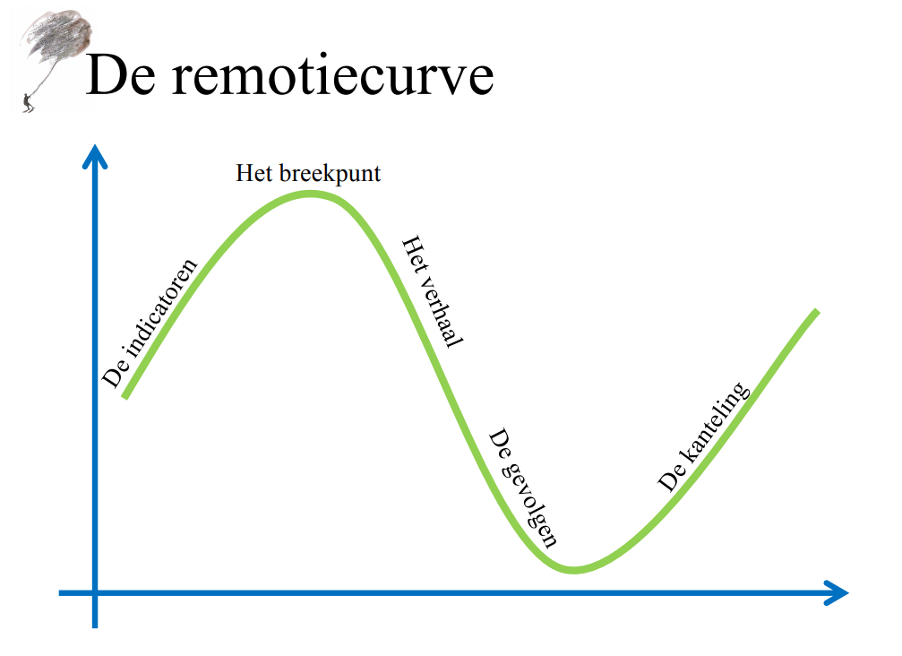 Wat gaat er vooraf aan remotie? Het proces vat Verheyen mooi samen in de remotiecurve (zie afbeelding). Verheyen benadrukt hierbij dat het geven van tijd voor het komen tot een kantelmoment erg belangrijk is.
