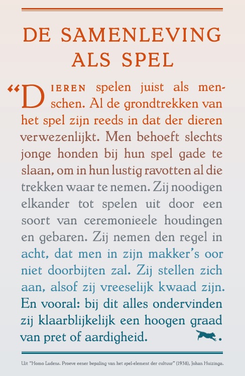 In Homo Ludens beschrijft Huizinga het spel van lustig ravottende jonge honden: “Zij nemen den regel in acht, dat men in zijn makker’s oor niet doorbijten zal.” In die geest hechten wij waarde aan de omgangsvorm ‘hard op de inhoud, zacht op de man’ (of vrouw). Omdat we er van overtuigd zijn dat je op die manier, en niet omgekeerd, iets duurzaams tot stand brengt.